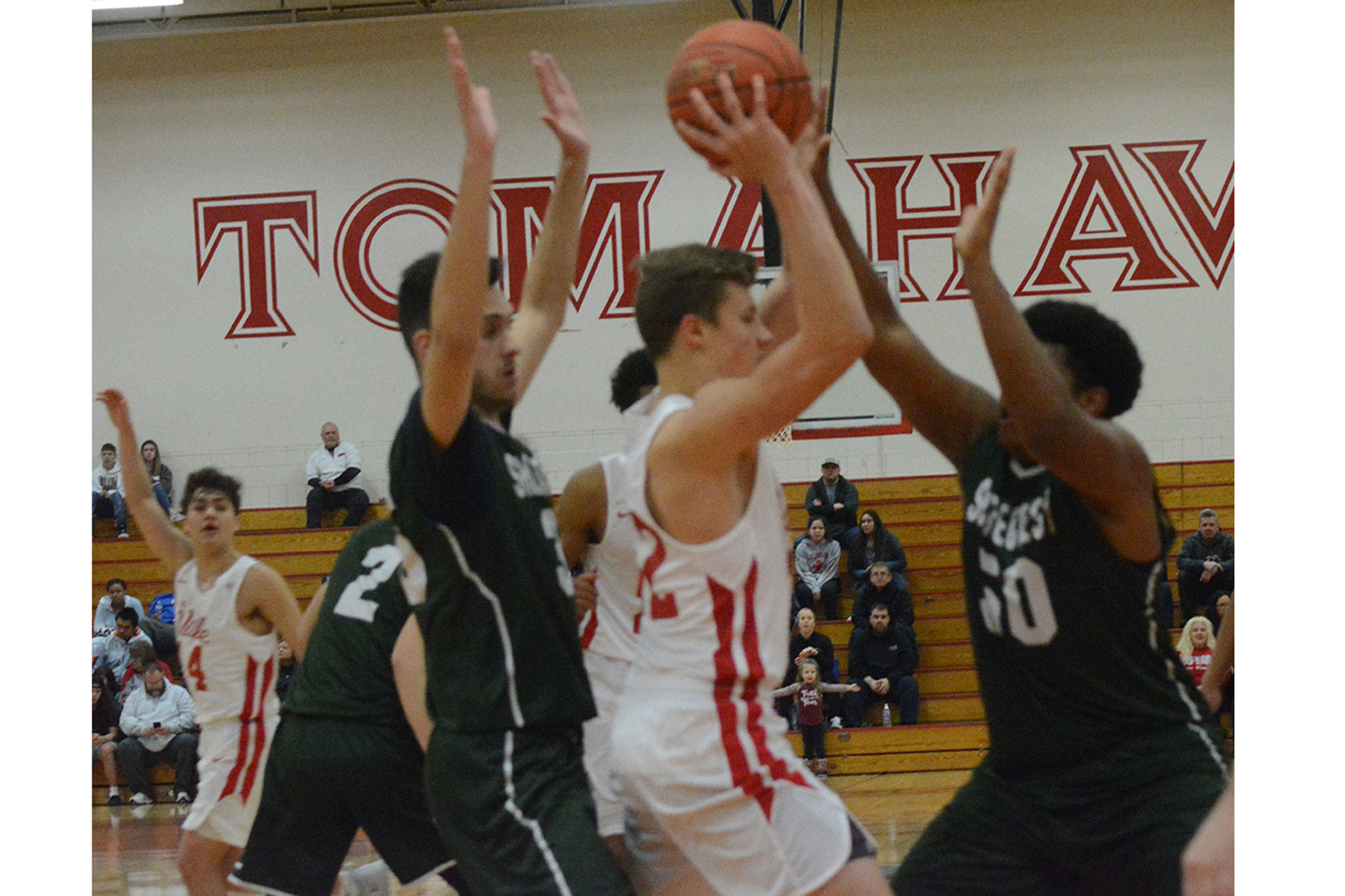 In M-P’s win, the Tomahawks dominated from the start, playing tough man-to-man defense and taking Shorecrest out of its game offensively. The Scots were forced into numerous turnovers and airballs as the home team took a 16-6 first-quarter lead.