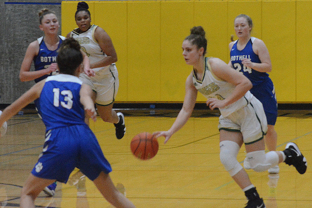 Bothell finally scored at the 3:27 mark after a steal and layup. After Crane knocked down another 3, the Cougars took advantage of some sloppy passing to run off seven-straight points before Maddison Hagglund assisted to Maddy Grandbois inside to make it 14-9 after one period.